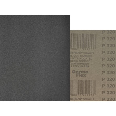CENA ZA OPAK. 50 SZTUK - Papier ścierny z serii WPF BLACK (Waterproof) wodoodporny, elastyczny, idealny nawet do najbardziej precyzyjnych prac jednego z liderów w branży materiałów ściernych firmy germaflex w standardowym rozmiarze arkusza 230x280 - GRADACJA 320