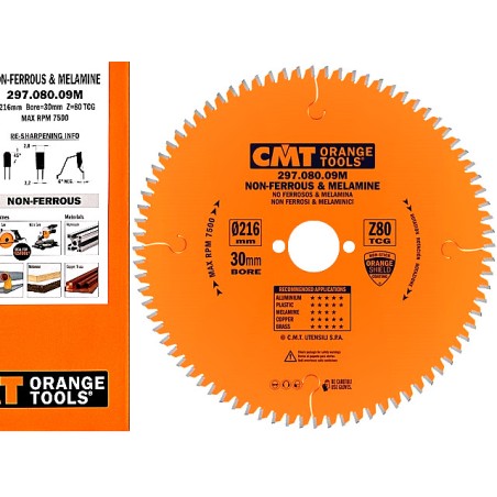 CMT - Najwyższa jakość - Maksymalna żywotność - Specjalistyczna powłoka P.T.F.E. - kontrola jakości na każdym etapie produkcji = Jeden z czołowych liderów w swojej dziedzinie! Tarcza 297.080.09M zalecana przede wszystkim do cięcia aluminium, mosiądzu, metali nieżelaznych, płyt wiórowo laminowanych i kompozytu o średnicy 216 mm x otwór 30 mm x 80 Zębów