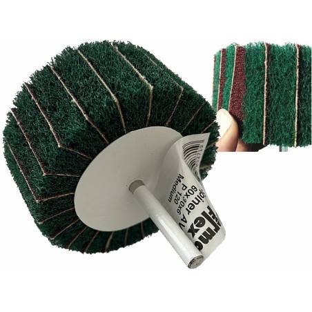 Uniwersalna o bardzo wszechstronnym zastosowaniu włóknina ścierna na trzpieniu do szlifowania takich materiałów jak metal, drewno, szkło czy chociażby plastik. Dzięki swojej elastyczności idealnie sprawdza się przy szlifowaniu i obrabianiu nieregularnych kształtów, ponieważ świetnie dopasowuje się do elementu podczas pracy, a przeplatane papierki dodatkowo zwiększają żywotność oraz wydajność w stosunku do samej włókniny. Kolejną zaletą włókniny jest jej prześwitująca budowa co przekłada się przede wszystkim na dużo mniejsze zapychanie, które bardzo ułatwia i wydłuża pracę, oraz umożliwia większy niż w tradycyjnych ściernicach dostęp powietrza. Więcej powietrza podczas obróbki to nic innego jak lepsze chłodzenie, a co za tym idzie zmniejszenie ryzyka przegrzania się lub odbarwienia obrabianego elementu. Jeśli jeszcze dodamy do tego bardzo dużą odporność włókniny na uszkodzenia, rozdarcia i środki chemiczne otrzymamy bardzo dobry produkt do szlifowania, matowienia, satynowania materiałów, bądź usuwania rdzy, starej farby. Przeznaczona przede wszystkim do maszyn ręcznych takich jak wiertarki, wkrętarki bądź szlifierki proste.
